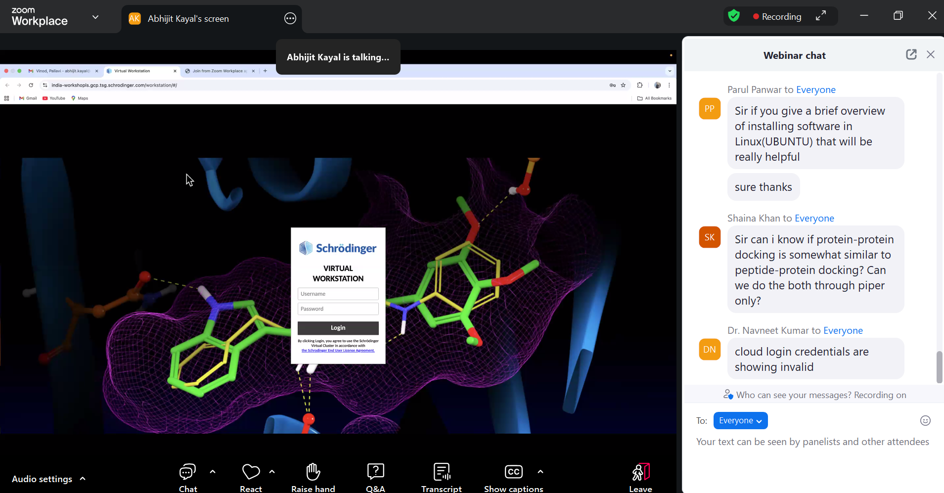 The hands-on sessions highlighted Molecular Docking and Molecular Dynamics. The workshop was structured to deliver comprehensive training and practical experience with advanced computational tools, equipping participants with essential skills in molecular modeling. A total of 89 participants actively joined and benefitted from the program.